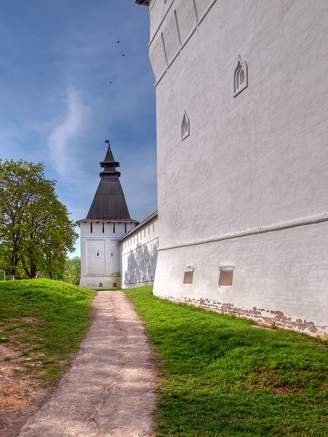 Пафнутий скончался в 1477 году, а в 1547 был причислен к лику святых. Маленький монастырь, став оплотом Московского государства в его борьбе за объединение русских земель, довольно быстро рос и богател. В конце XVI века, опасаясь войны с Польшей, Московское правительство укрепляет Свято-Пафнутьев Боровский монастырь и возводит мощные крепостные стены. В польском "Дневнике событий Смутного времени", в записи, относящейся к 1610 году, указано, что "монастырь был каменный и довольно сильно укрепленный, кругом была глубокая вода". Стены имеют три яруса: дальнего, среднего и ближнего боя. Одна из летописей XVII века повествует, что когда Лжедмитрий II осадил монастырь, он встретил сильное сопротивление и только благодаря измене воеводы смог ворваться на территорию монастыря. Но защитники под предводительством князя Волконского не прекращали сопротивления и все были убиты внутри собора. В память об этом подвиге в 1777 году город Боровск получил свой герб: сердце с крестом (символом верности) в лавровом венке, и была устроена поминальная часовня князей Воротынских.